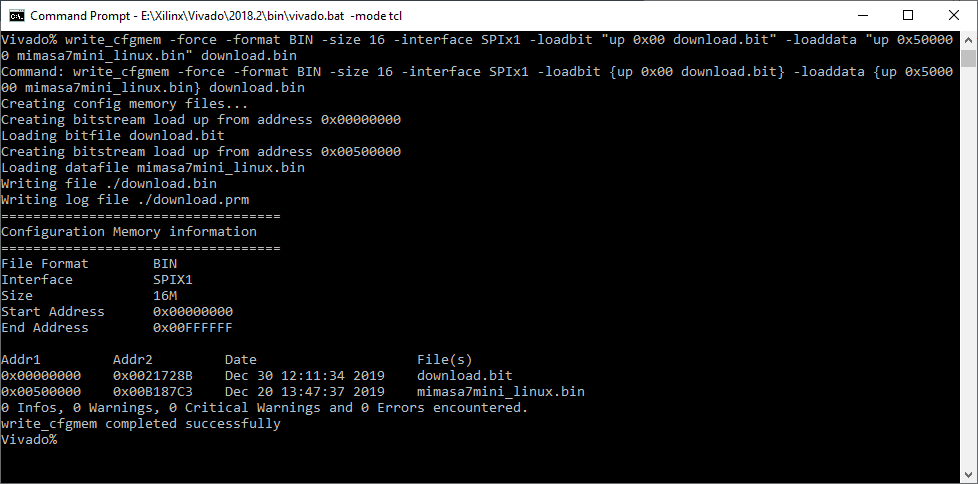 write_cfgmem -force -format BIN -size 16 -interface SPIx1 -loadbit "up 0x00 download.bit" -loaddata "up 0x500000 mimasa7mini_linux.bin" download.bin