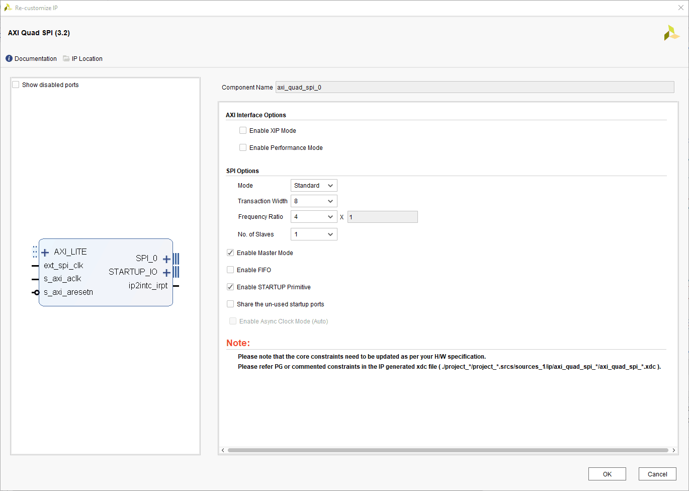 We have already created a block diagram for the previous article, we need to add SPI in the block diagram to be able to use a flash tool, for that open the block diagram in Vivado. Right-click and select “Add IP” from the popup menu, search & add “AXI Quad SPI” to the design by double-clicking it. Double-click “AXI Quad SPI” IP and customize its settings as shown in the figure.