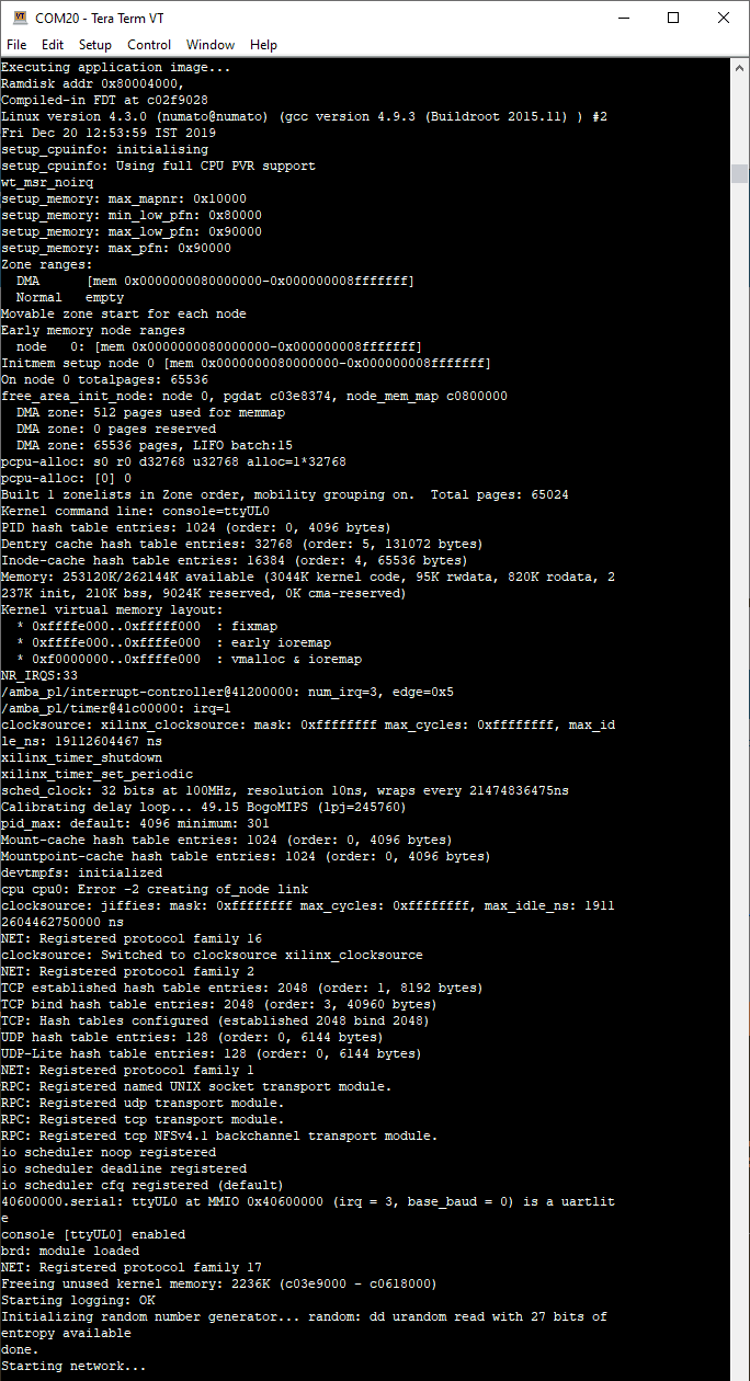 Once the binary image is completed downloading, the tool will reboot the FPGA and let it load the configuration data from the newly downloaded image. If everything went well, the bootloader will start copying Linux kernel image to DDR and we will see the following message in the serial terminal emulation software.
