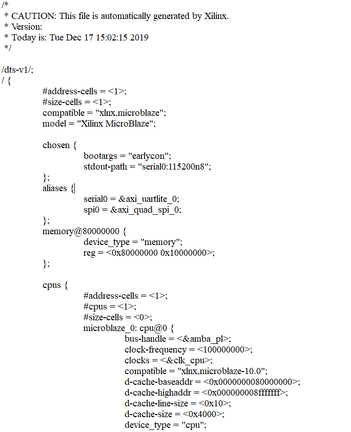 We have to merge the ‘.dtsi’ and ‘.dts’ files. Merge these two files using a text editor (like Notepad++ etc) and copy the contents of system-top.dts and paste them in the .dtsi file just after the line ‘model = “Xilinx MicroBlaze”’. Don’t forget to add “/dts-v1/;” at the top of .dtsi file. The final content should look like this: