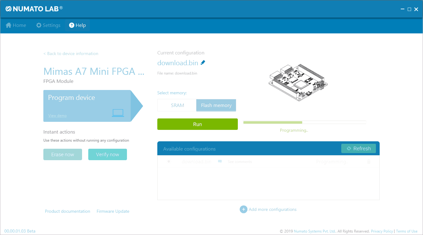 For steps on how to program Mimas A7 Mini using Tenagra, refer the Getting started with Tenagra FPGA System Management Software article.