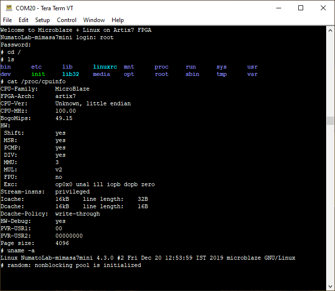 Login to Linux as “root” with password as “mimasa7mini”. The image below shows root directory structure, cpuinfo and uname -a outputs: