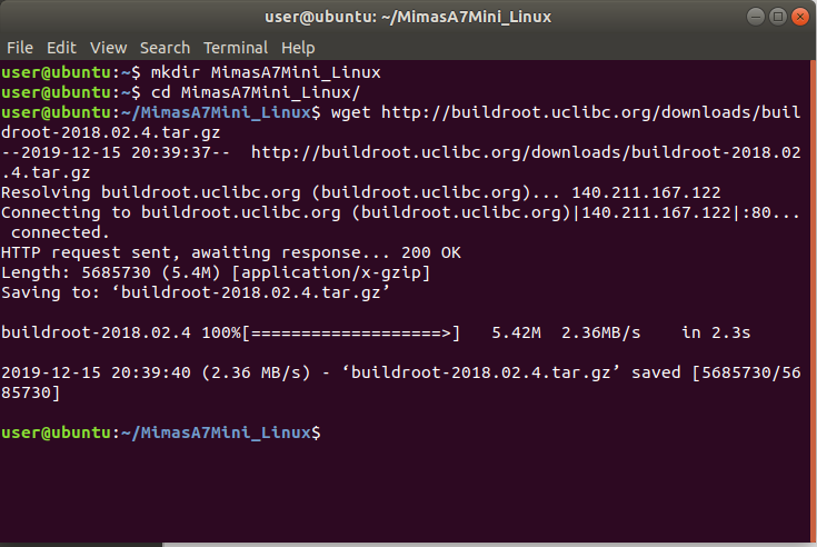Step 2: Create a convenient folder on your Linux system and ‘cd’ to that folder. The author created a directory with the name “MimasA7Mini _Linux” in his “home” directory. Now download “buildroot” to the created directory, either manually or by using the following command: