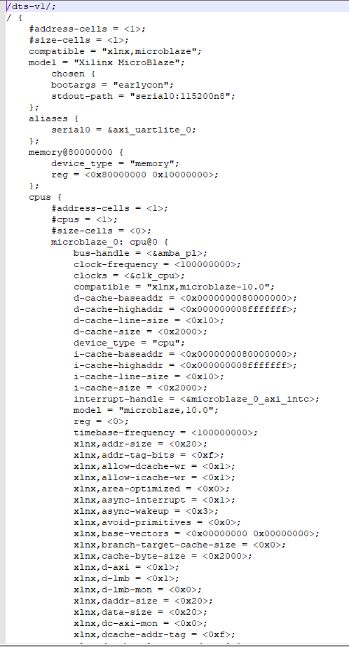 Step 5: We have to merge the ‘.dtsi’ and ‘.dts’ files. Merge these two files using a text editor (like Notepad++ etc) and copy the contents of system-top.dts and paste them in the .dtsi file just after the line model = “Xilinx MicroBlaze”. Don’t forget to add “/dts-v1/;” at the top of .dtsi file also. The final content should look like this: