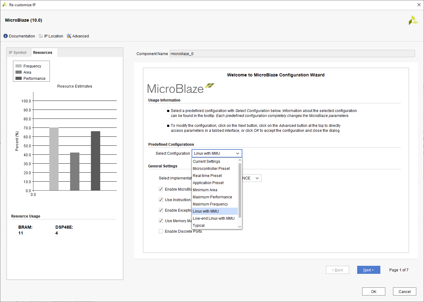To run our Linux system, we will be modifying the above created Microblaze based design. We need to modify this Microblaze IP block to be able to run Linux on the Mimas A7 Mini board. Open the above-created block design, double click on the Microblaze block and choose the Select Configuration as “Linux with MMU” as shown in the image below.