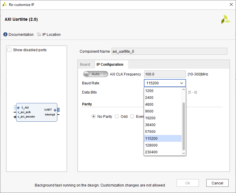 Also, we have to change the baud rate of UART. Double click on “uartlite” IP and set the baud rate as “115200”.