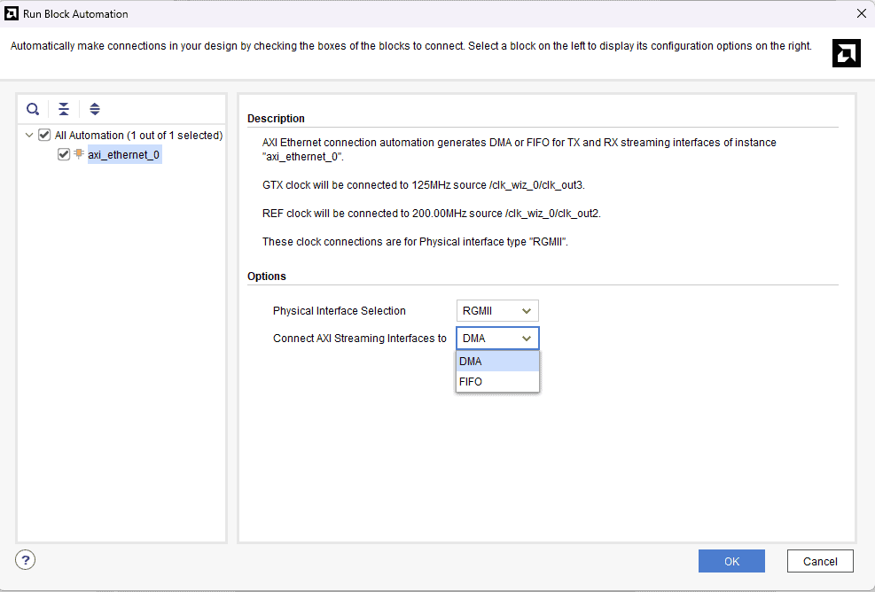 Run Block Automation for AXI Ethernet and select “DMA” for the AXI Streaming interface.