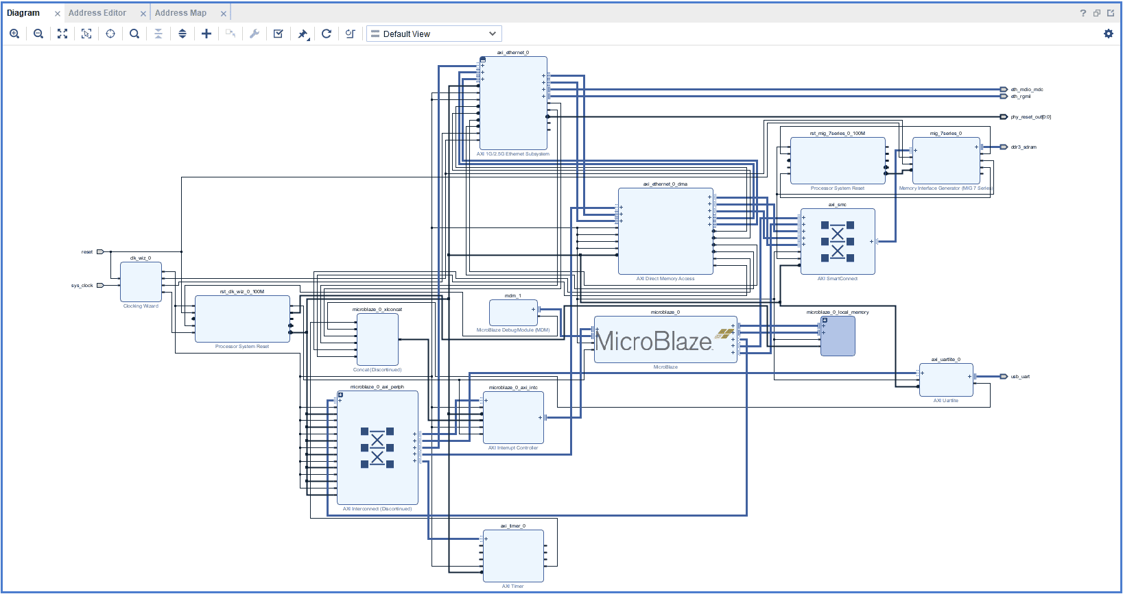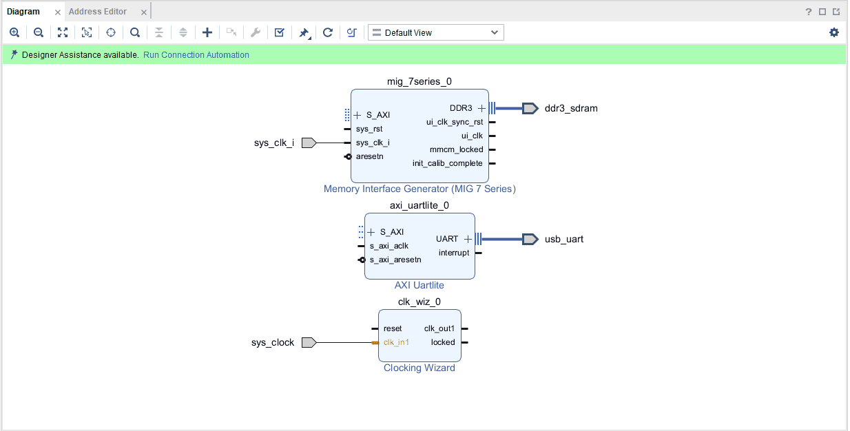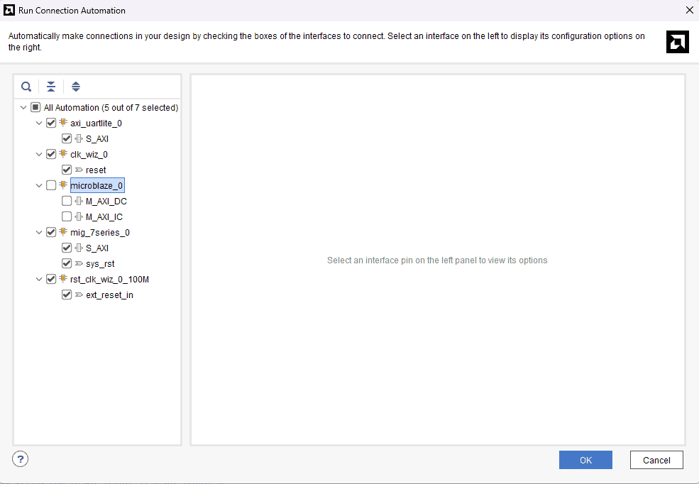Click Run Connection Automation and select all to connect AXI interfaces of MIG, Uartlite IPs, and their clocks and resets. Uncheck the microblaze_0 part in it and click OK.