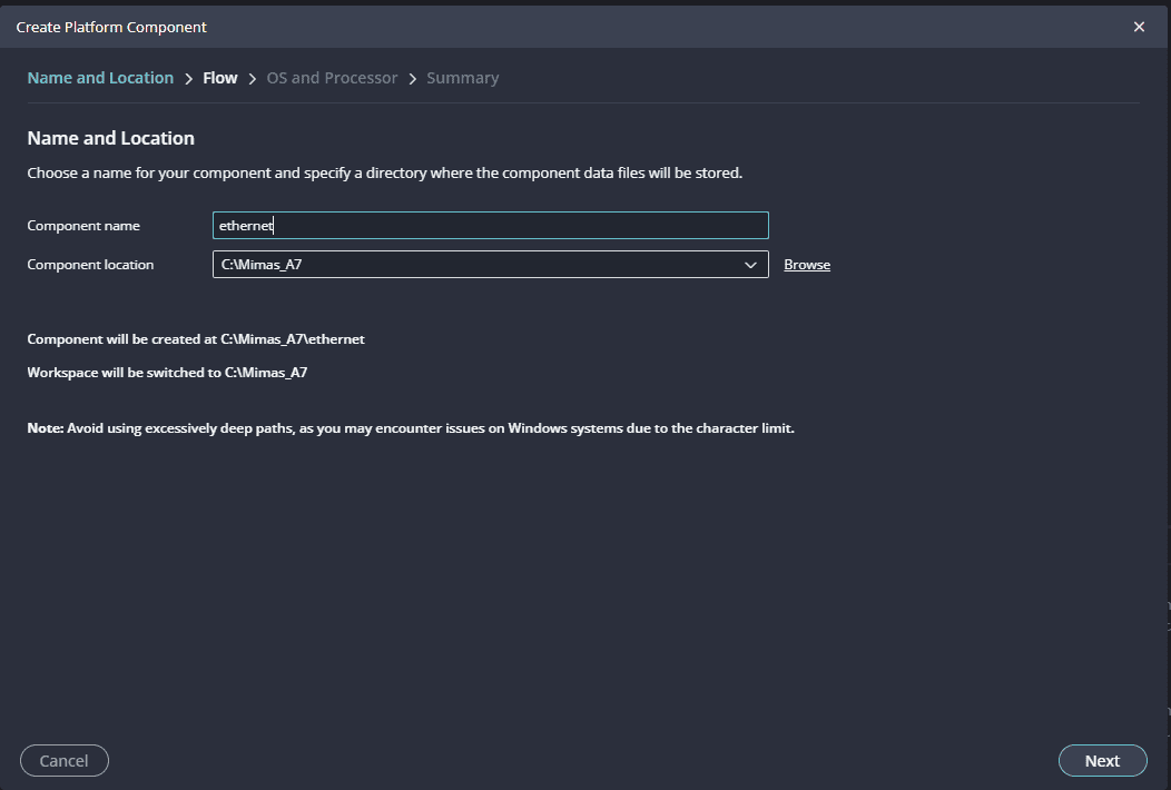Give the component name and the platform location and click on “Next”