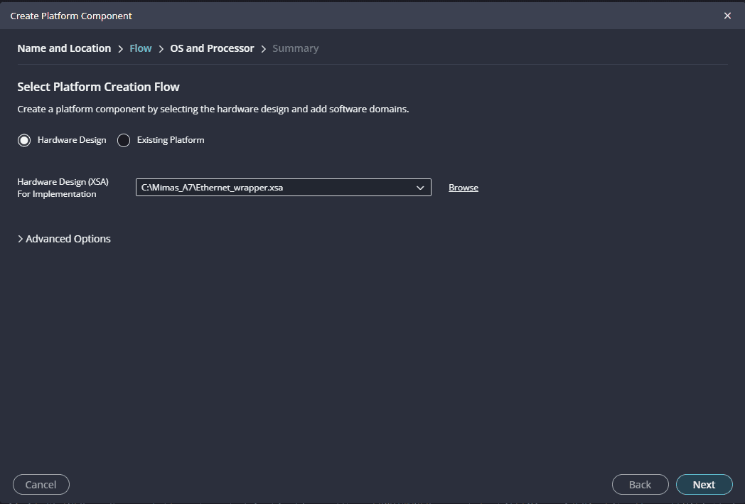 Launch Vitis IDE and create a new platform for the project, by selecting “Create Platform Component”, click “Next”, in the Flow tab select the XSA file saved and finally click “Next” and “Finish” respectively.