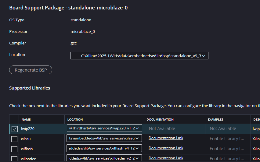 After building the platform go to Board Support Packages configuration of the newly created platform and add lwip220 library to the platform.