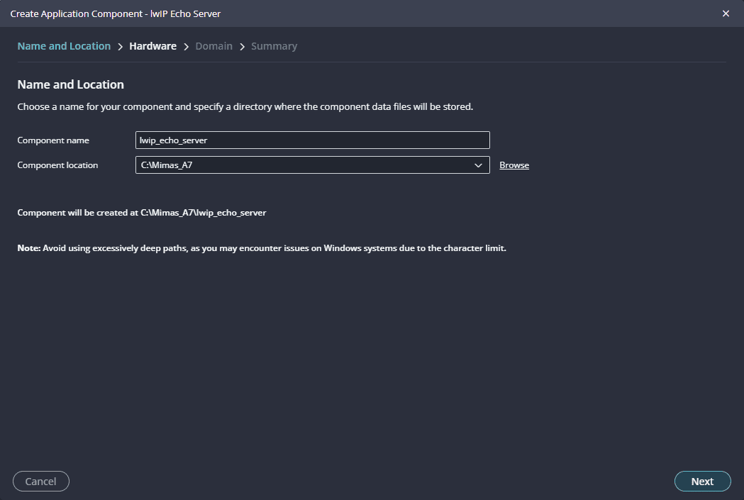 Next create the lwip echo server Application component by selecting the “IwIp Echo Server” template from the “examples”.