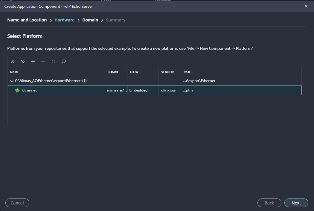 Once these parameters are set, you can add the lwIP echo server application to the platform.