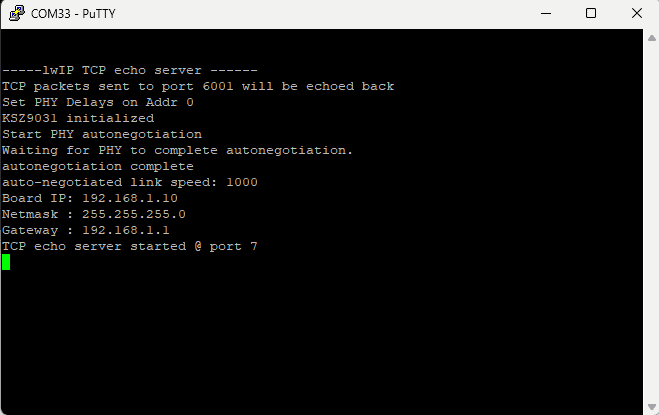 Open a telnet session with IP Address 192.168.1.10 (IP address as per main.c) at port 7, give input through the keyboard and observe the output. If you enter a character from the keyboard, you can observe the transmitted and echoed characters on telnet as shown.