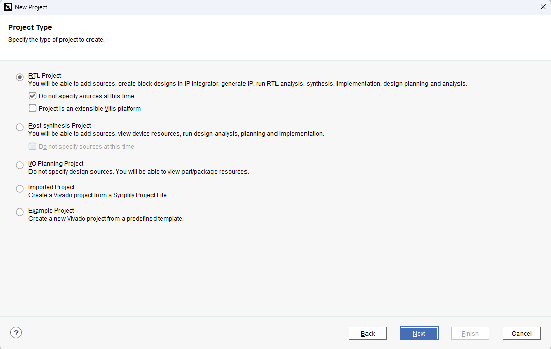 In the Project Type window, select RTL Project and check the option “Do not specify sources at this time”. Click Next.