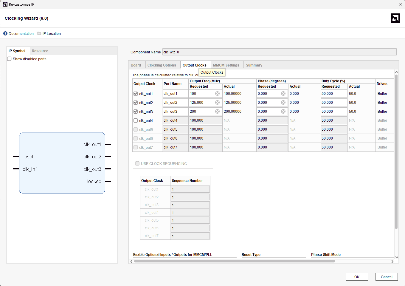 clk_out1 frequency to 100 MHz