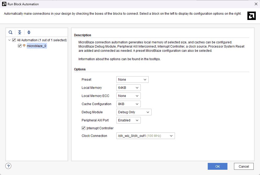 Click Run Block Automation with 64 KB of local memory and interrupt controller enabled.