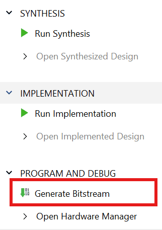 Click “Generate Bitstream” under PROGRAM AND DEBUG section and click “Yes” in any subsequent dialog window which comes up.