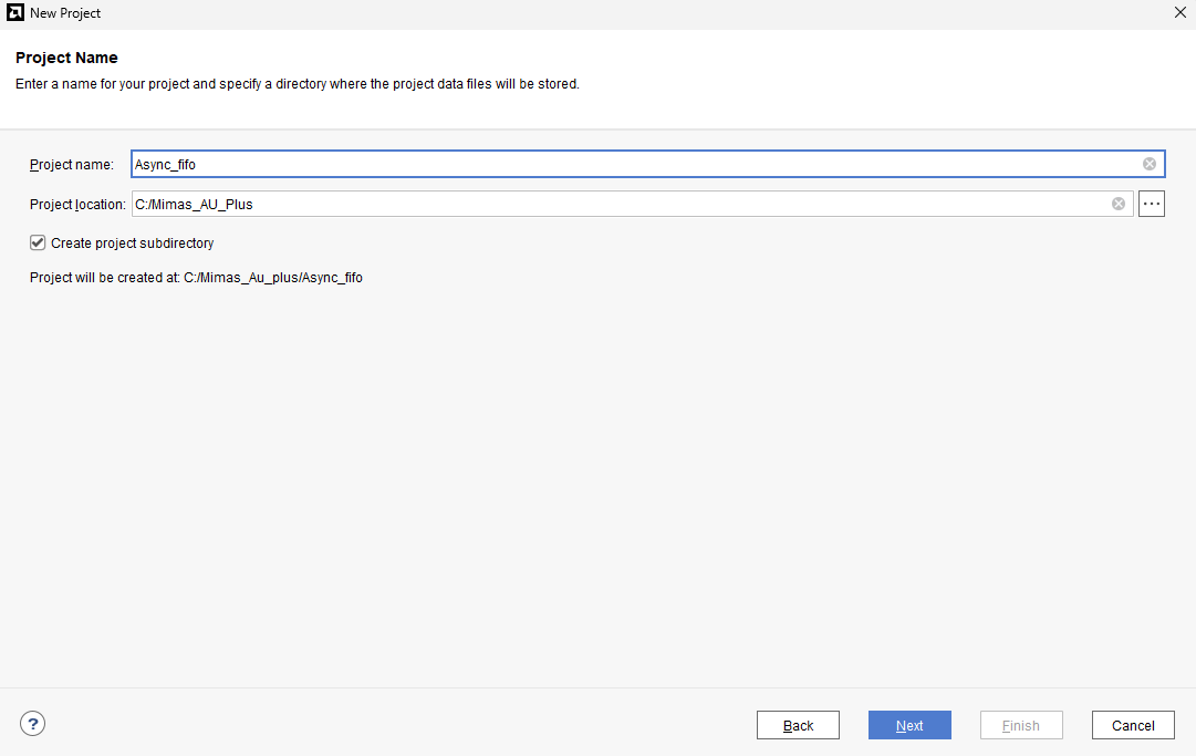 Type in a project name and save it at a convenient location. For this example “Async_fifo” is used as project name, but feel free to use any name. Select the check box below to keep all project files in a single folder. The image below shows the settings for the example project. Click “Next” to continue.