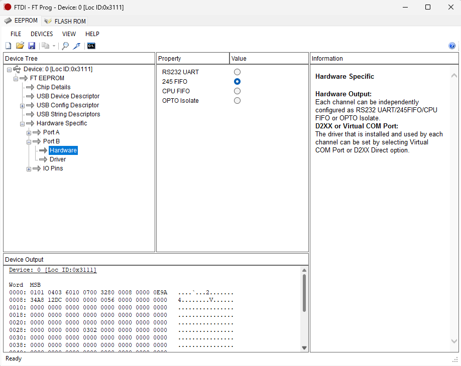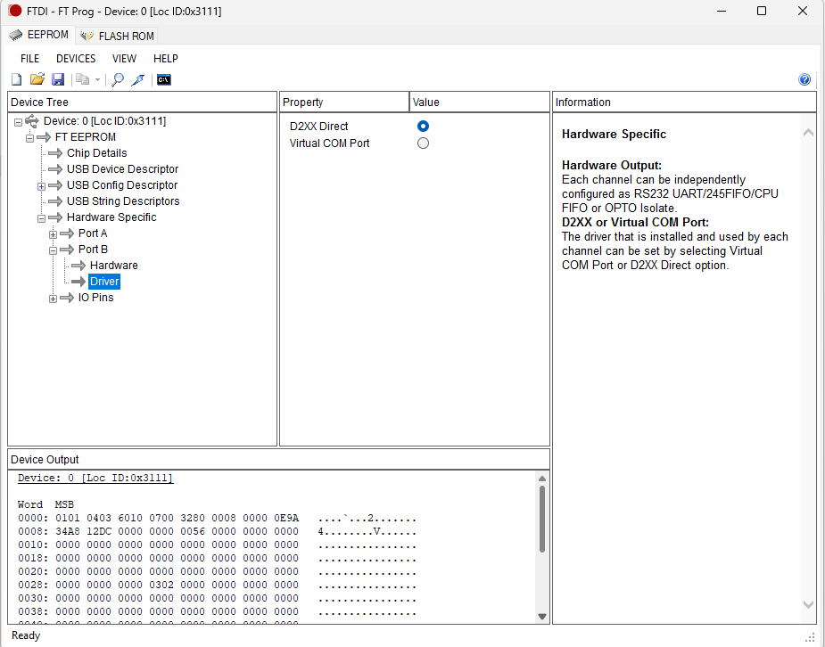 Now go to Hardware Specific -> Port B -> Driver and select D2XX Direct.