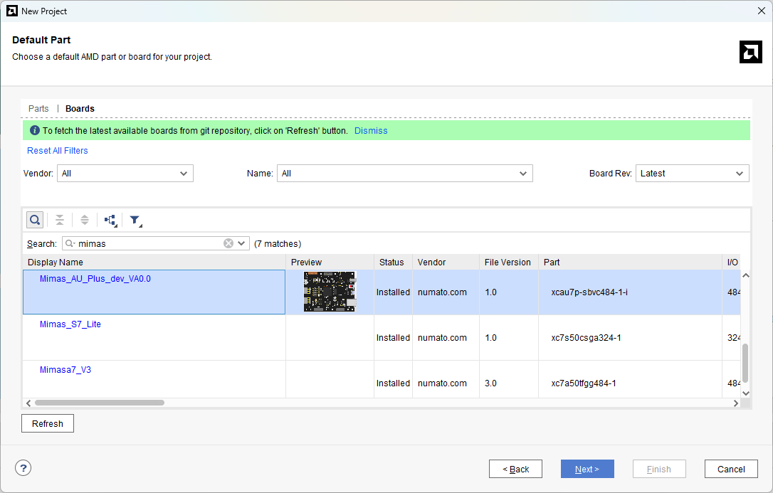 In the Default Part window, select “Mimas_AU_Plus_dev_VA0.0” from the Boards option. If not listed, make sure board support files are installed correctly. Click Next to continue.