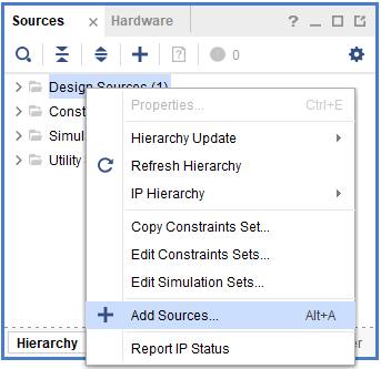 In the “Sources” tab, right-click on the “Design Sources” and select “Add Sources”. It will open a new “Add Sources” window.
