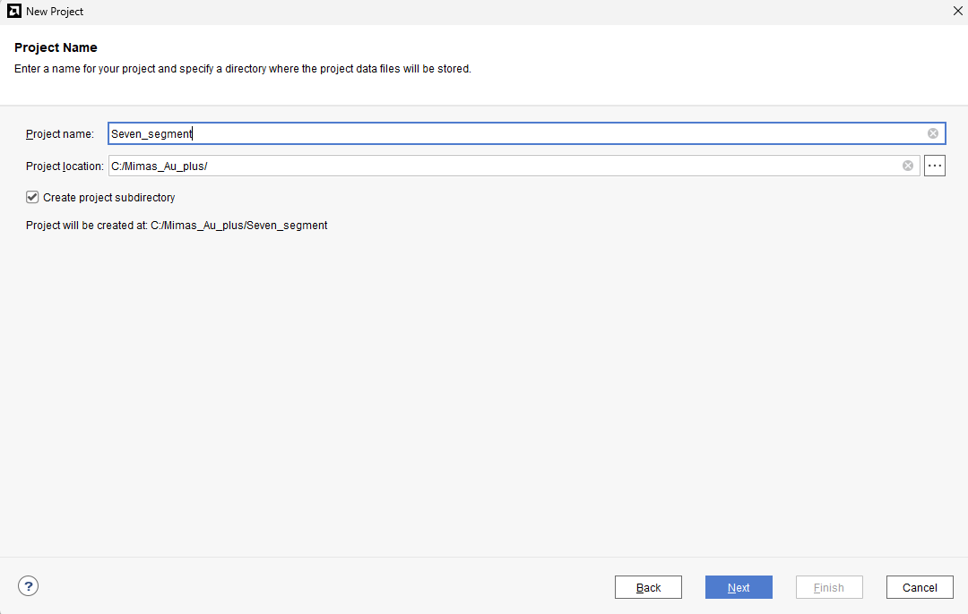 Enter a name for the project and save it at a suitable location. Check the option “Create project subdirectory”. Click Next to continue.