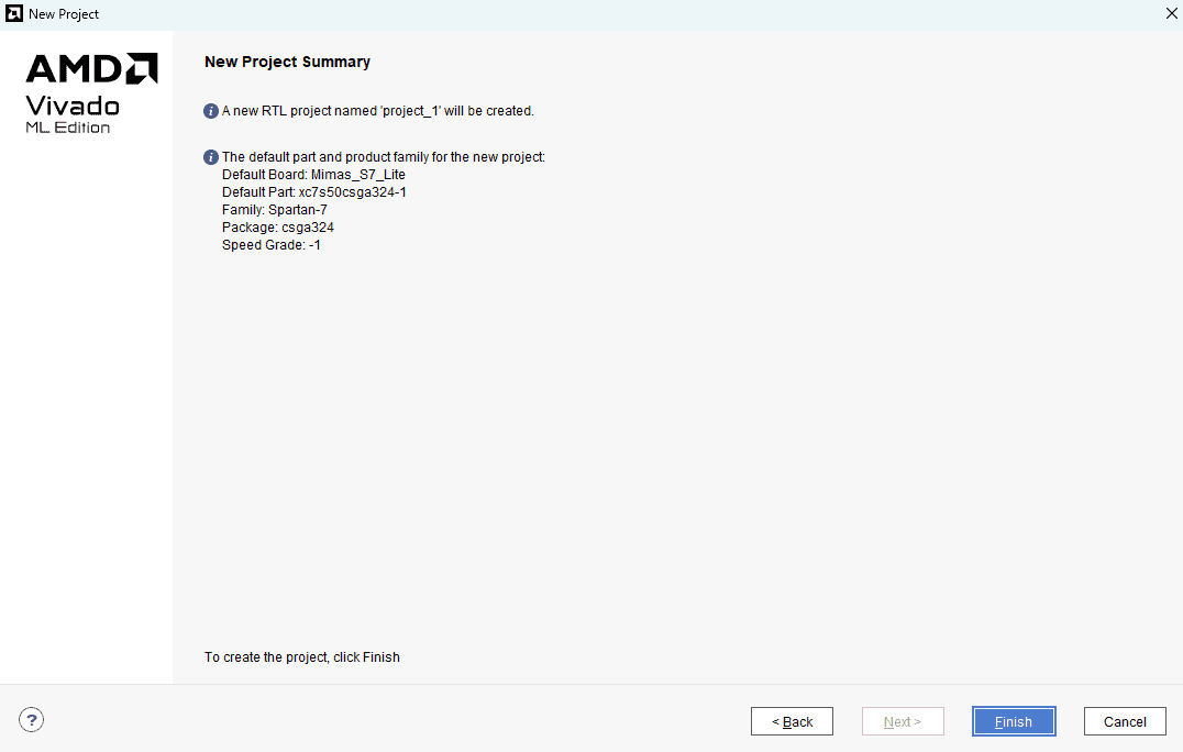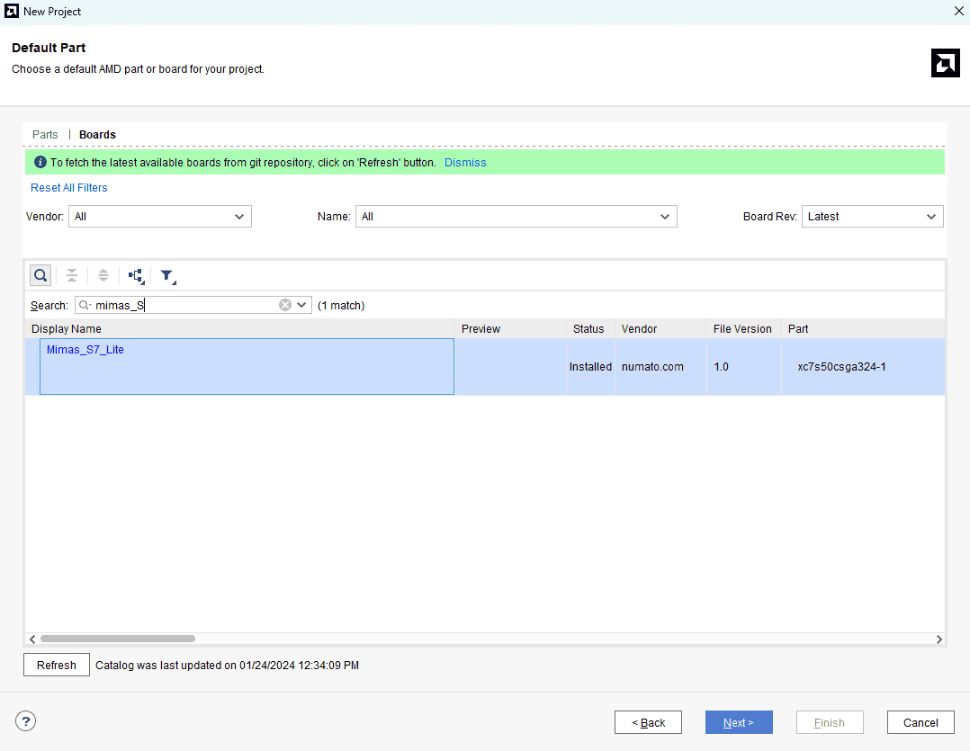Step 4 :In the “Default Part” tab, select “Mimas_S7_lite” from the “Boards” section. If Mimas_S7_lite is not listed, make sure board support files are installed correctly. Click “Next” to proceed.
