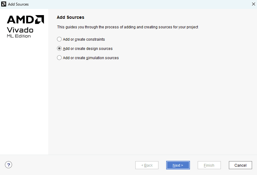 Step 6 :To design a AND Gate, we have to add sources to the project. To do this, select “Add Sources” under the “Flow Navigator” -> “PROJECT MANAGER” section. Now select “Add or create design sources” and click “Next”.