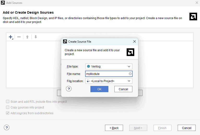 Step 7:Now, select “Create File”. The “Create Source File” window will open, select the “File type” as “Verilog” and give the file name as in the image below. Click “OK” and then click “Finish”.