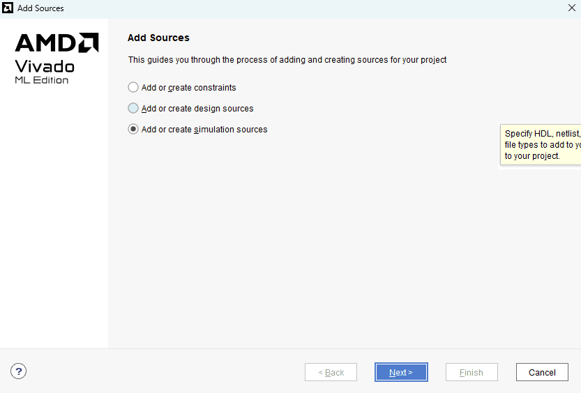 Step 11 : Again, select “Add Sources” under the “Flow Navigator” -> “PROJECT MANAGER” section. This time select “Add or create simulation sources” and click “Next”.