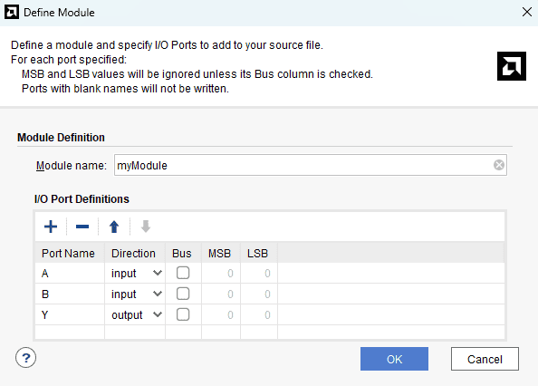 Step 8 :The “Define Module” window will open. Now, we have to add the ports required for our project. For our AND Gate module, we will need 3 ports. “A” and  “B” as the input port and “Y” as the output port. To add these ports to our project, in the “Define Module” window click on the “+” button to add ports and name the ports and change the direction of the port appropriately. Click “OK”. (refer the image below)