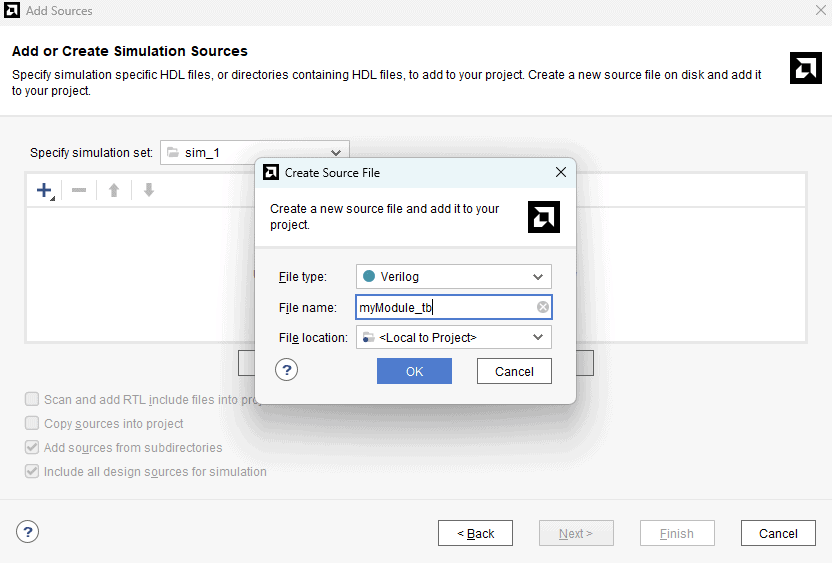 Step 12 : Select “Create File”, give the name for the test bench as “myModule_tb” and choose “File type” as “Verilog” as in the image below. Click “OK” then “Finish”.