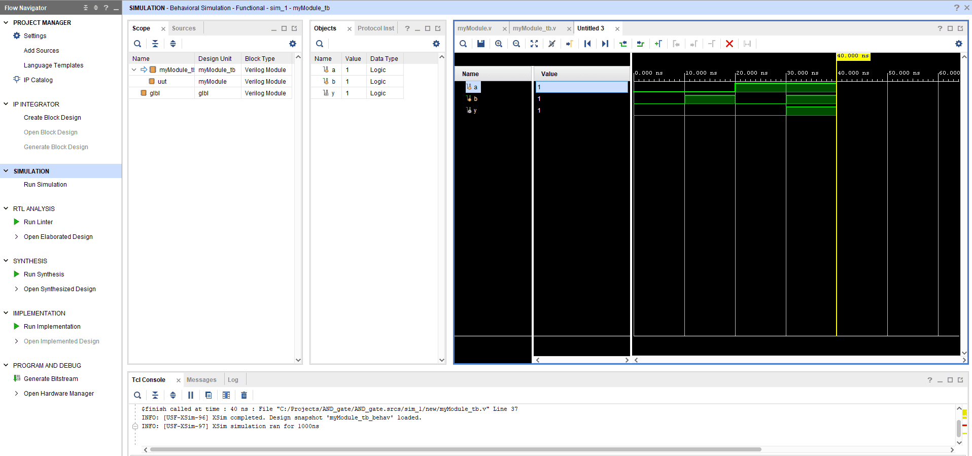 The test bench is just another module, with no I/O ports as I mentioned earlier. I have created a wire named “y” and reg named “a” and “b”.  The wire “y” is connected to the output port (port B) of myModule. The result should appear on the wire “y” in the simulation.