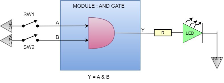 Let’s come back to our module and think about how we can implement the same on the hardware. The module in question is an AND gate. As we know, the output of an AND gate is high only when both the inputs are high and the output is low if any of the inputs are low. We can have many possible hardware configurations to test this module. The easiest would be with a switch and an LED. See the proposed hardware configuration in the picture below.