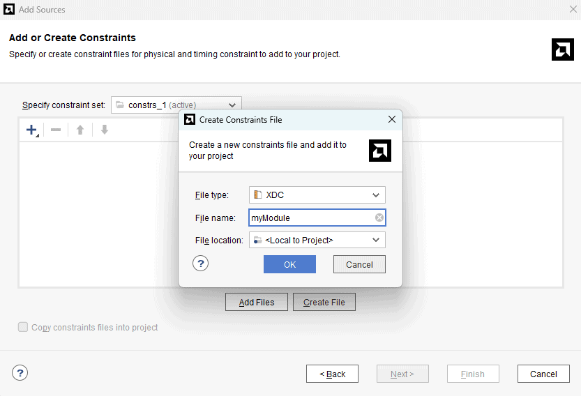 Step 2 : Click on “Create file” and give a name for the XDC and select “File type” as “XDC”. Click “OK” and then “Finish”.