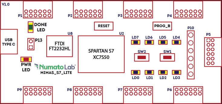 Let’s take a closer look at the Mimas S7 lite FPGA Development Board. The following image shows the LED and switch we are planning to use on Mimas S7 Lite.
