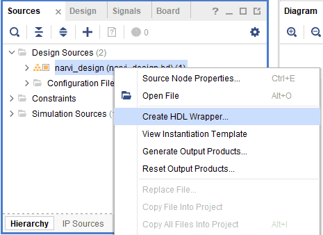 Step 2: Right-click on the block design in the “Sources” window, select “Create HDL Wrapper” from the popup menu. Click “OK” on the window that appears to finish generating the wrapper.
