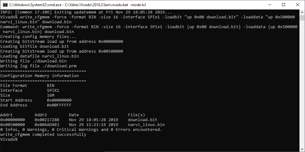 write_cfgmem -force -format BIN -size 16 -interface SPIx1 -loadbit "up 0x00 download.bit" -loaddata "up 0x500000 narvi_linux.bin" download.bin