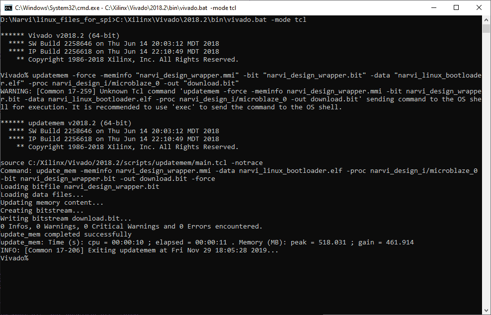 Open the command prompt and ‘cd’ to the directory where the binary files and executable file (in author case the directory is ‘linux_files_for_spi’) are located. Merge the Bootloader executable image with a bit file by running the following commands: