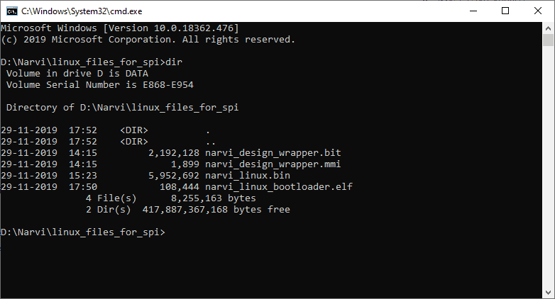 If this command succeeded, you will see a few new files in the directory and one of them would be “download.bin”. This is the final binary image that we need to download to Narvi’s SPI flash. The following image shows all files in my directory after executing all the above-mentioned steps.