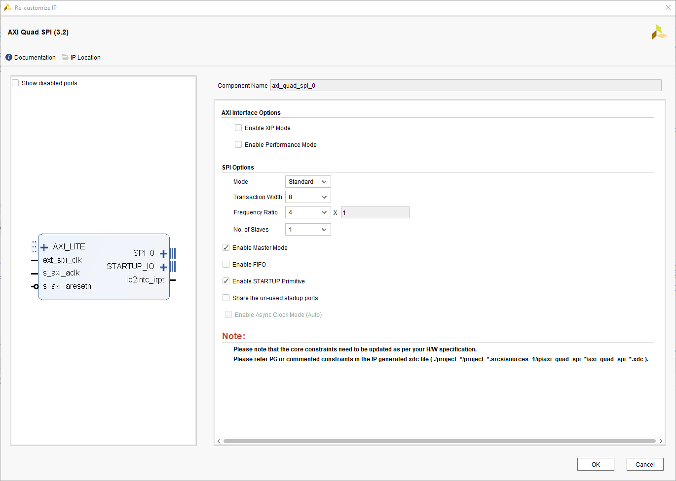 We have already created a block diagram for the previous article, we need to add SPI in the block diagram to be able to use a flash tool, for that open the block diagram in Vivado, click on “add IP” and add “AXI Quad SPI”. Double click on the AXI Quad SPI block and change its settings as shown in the figure. Make sure to check the “Enable STARTUP Primitive” option.