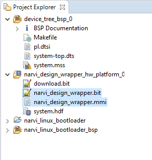 2. The bit file(.bit) for the Microblaze system and the Memory Map file .mmi)  (Both files can be found in your SDK’s Project Explorer under the project named “narvi_design_wrapper_hw_platform_0” or similar. Please see the image below).