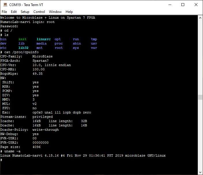 You can log in to Linux as “root” with a password as “Narvi”. The image below shows the root directory structure, cpuinfo and “uname -a” outputs: