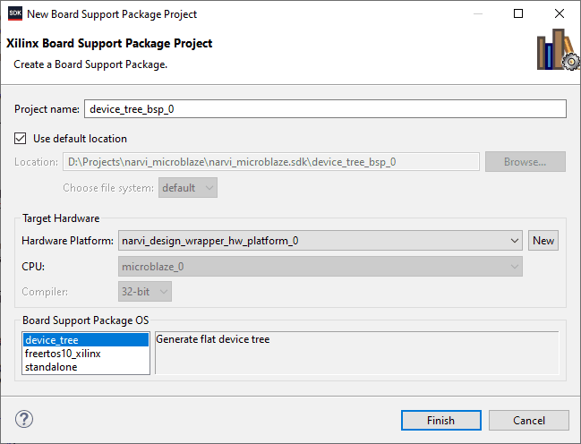 Step 4: Go to File -> New select “Board Support Package”. In the dialog window, select “device_tree” under “Board Support Package OS” and press “Finish” and then “OK” in another dialog that opens.