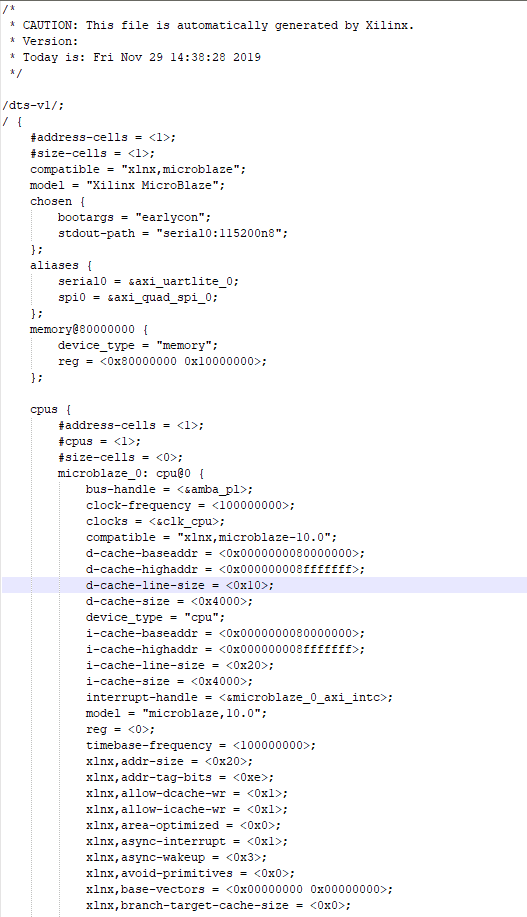 Step 5: We have to merge the ‘.dtsi’ and ‘.dts’ files. Merge these two files using a text editor (like Notepad++ etc) and copy the contents of system-top.dts and paste them in the .dtsi file just after the line ‘model = “Xilinx MicroBlaze”’. Don’t forget to add “/dts-v1/;” at the top of .dtsi file also. The final content should look like this: