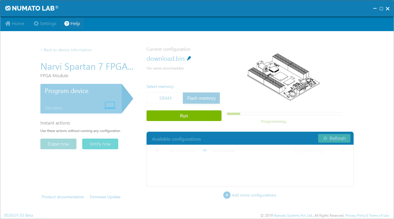 For steps on how to program Narvi using Tenagra, refer the Getting started with Tenagra FPGA System Management Software article.