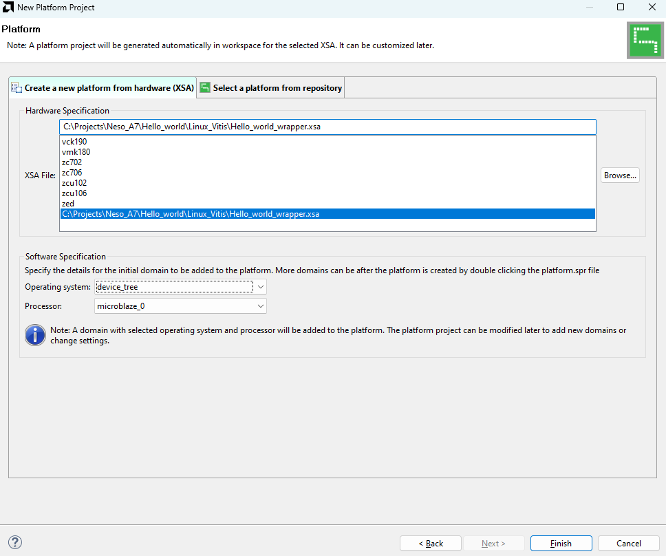 Step 4: Click on “Create Platform Project“. In the “Create a new platform from hardware (XSA)” browse and select your XSA file. Select the “Operating system” as “device_tree” and click on “Finish“. This should generate a system.dts file along with a .dtsi file. We need both of them.