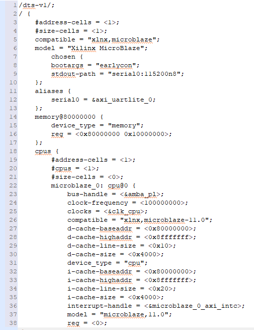 Step 5: We have to merge the ‘.dtsi’ and ‘.dts’ files. So open both of them in some text editor (Notepad++ etc) and copy the contents of system.dts and paste them in the .dtsi file just after the line ” model = “Xilinx MicroBlaze” .  Don’t forget to add “/dts-v1/;” at the top of .dtsi file also. The final content should look like this: