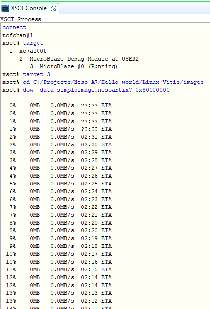 Step 2: First run the Hello World program again to make sure everything is connected properly and works. Now, go to Vitis -> XSCT Console, type in a command “target” it will show all the targets connected, note down the number where MicroBlaze 0 is connected (3 in this article), connect to MicroBlaze by giving the command: